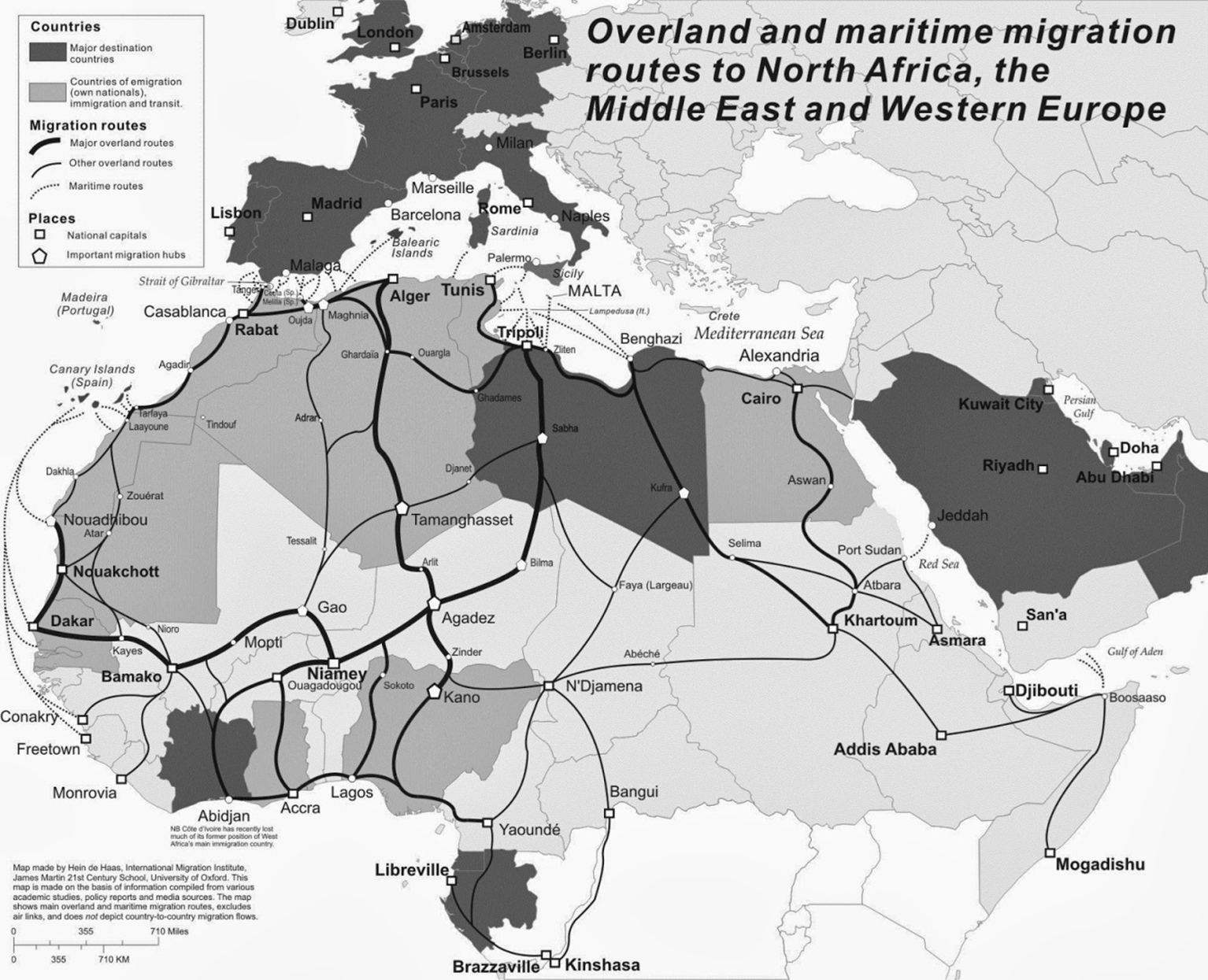 According to different estimates, between 65,000 and 120,000 sub-Saharan Africans enter the Maghreb (Mauritania, Morocco, Tunisia, Algeria, and Libya) yearly, of which 70 to 80 percent are believed to migrate through Libya and 20 to 30 percent through Algeria and Morocco. Several tens of thousands (not hundreds of thousands, as media coverage might suggest) of sub-Saharan Africans try to cross the Mediterranean each year (Hein de Haas, 2006).